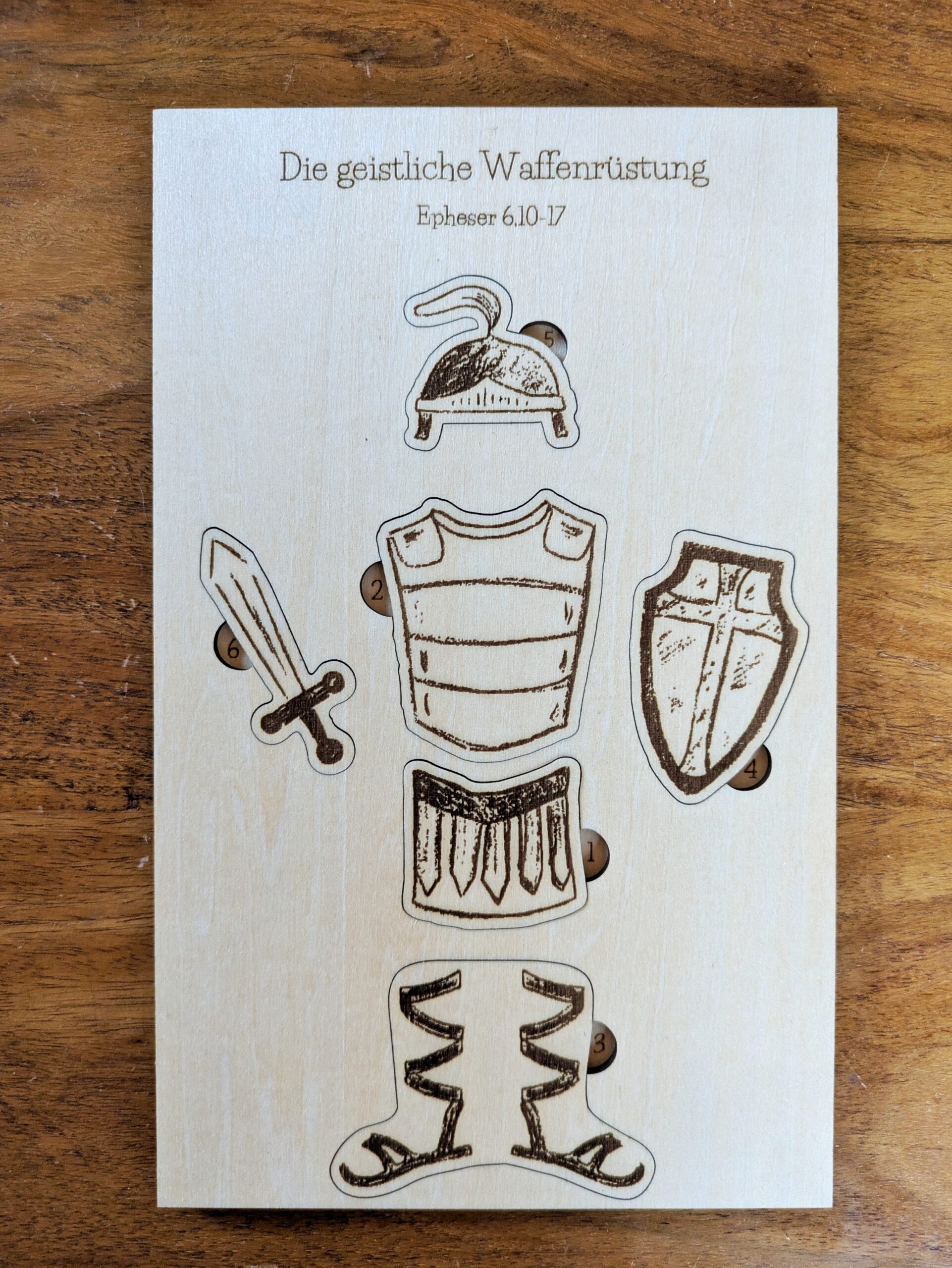 In den kleinen Einkerbungen, die das Herausnehmen der Puzzleteile erleichtern, sind die Zahlen 1-6 eingraviert, sodass sich die Bibelstelle in der richtigen Reihenfolge puzzlen lässt. Perfekt geeignet, um die Verse der Waffenrüstung spielerisch auswendig zu lernen.