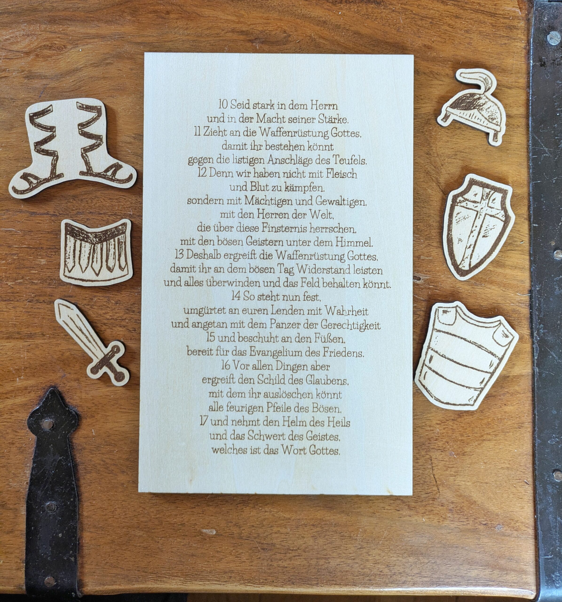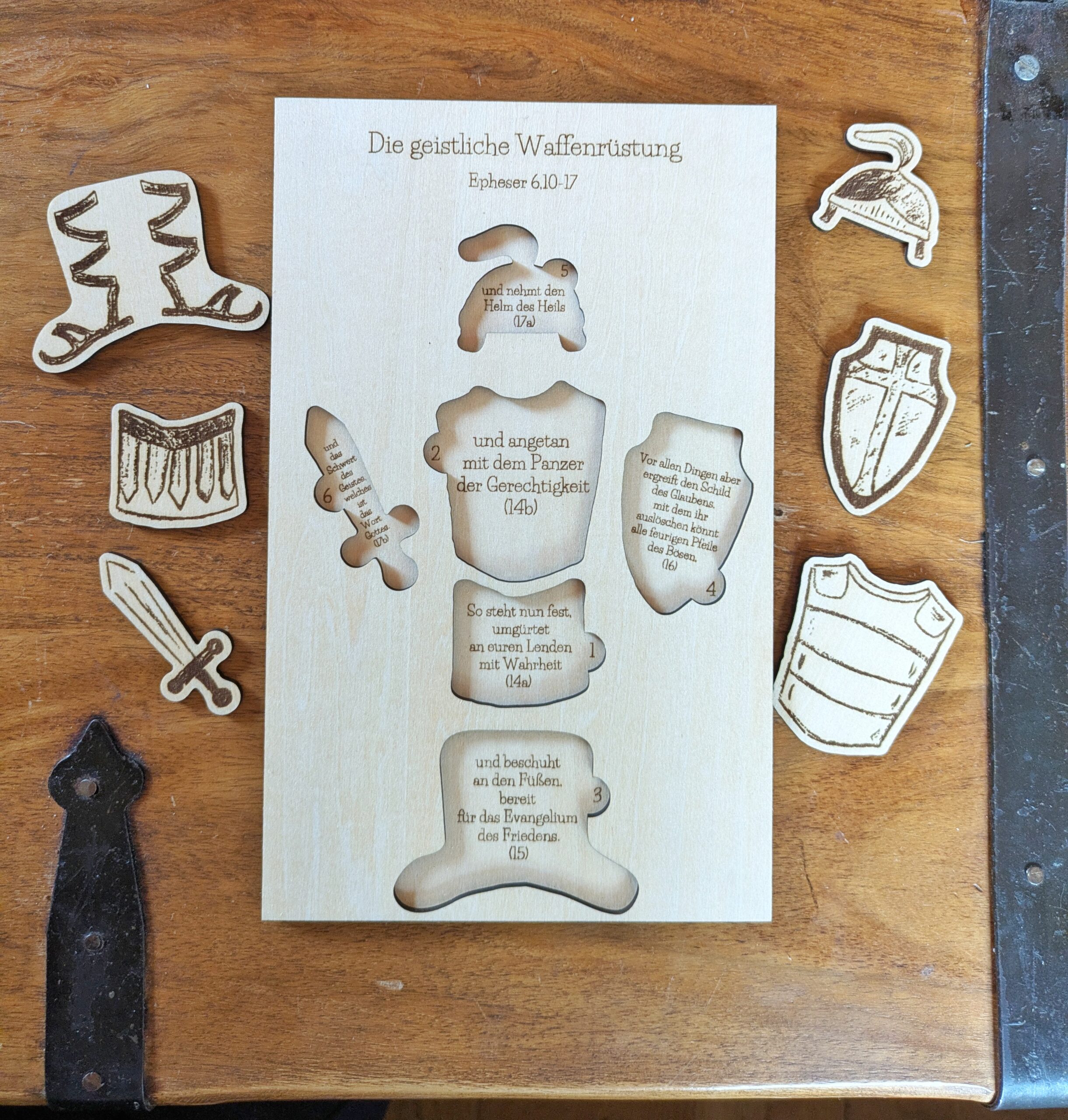 Der Helm des Heils, der Schild des Glaubens, der Gürtel der Wahrheit, der Brustpanzer der Gerechtigkeit, das Schwert des Geistes, die Schuhe der Bereitschaft für den Frieden. Jedes Rüstungsteil ein Puzzleteil.