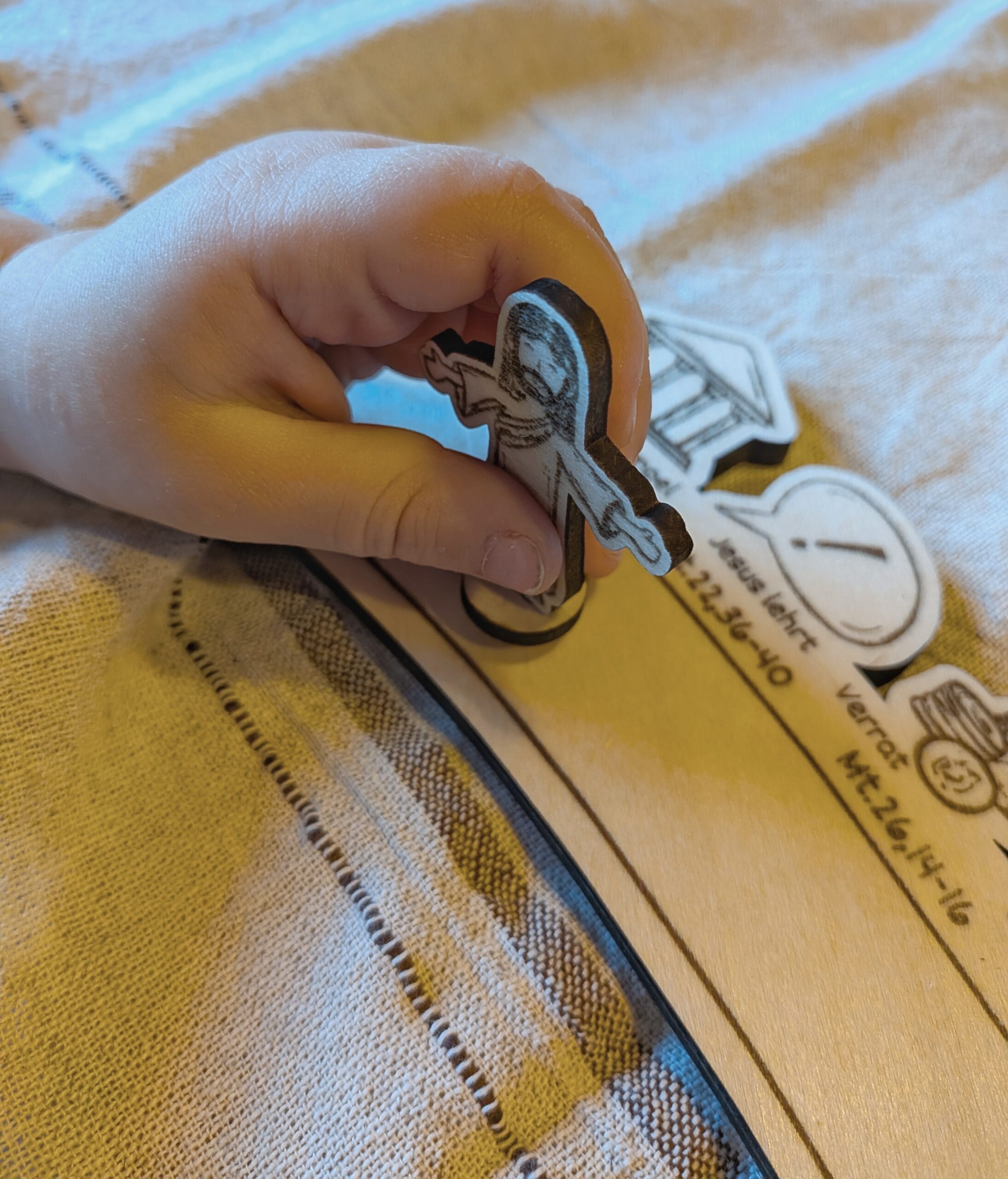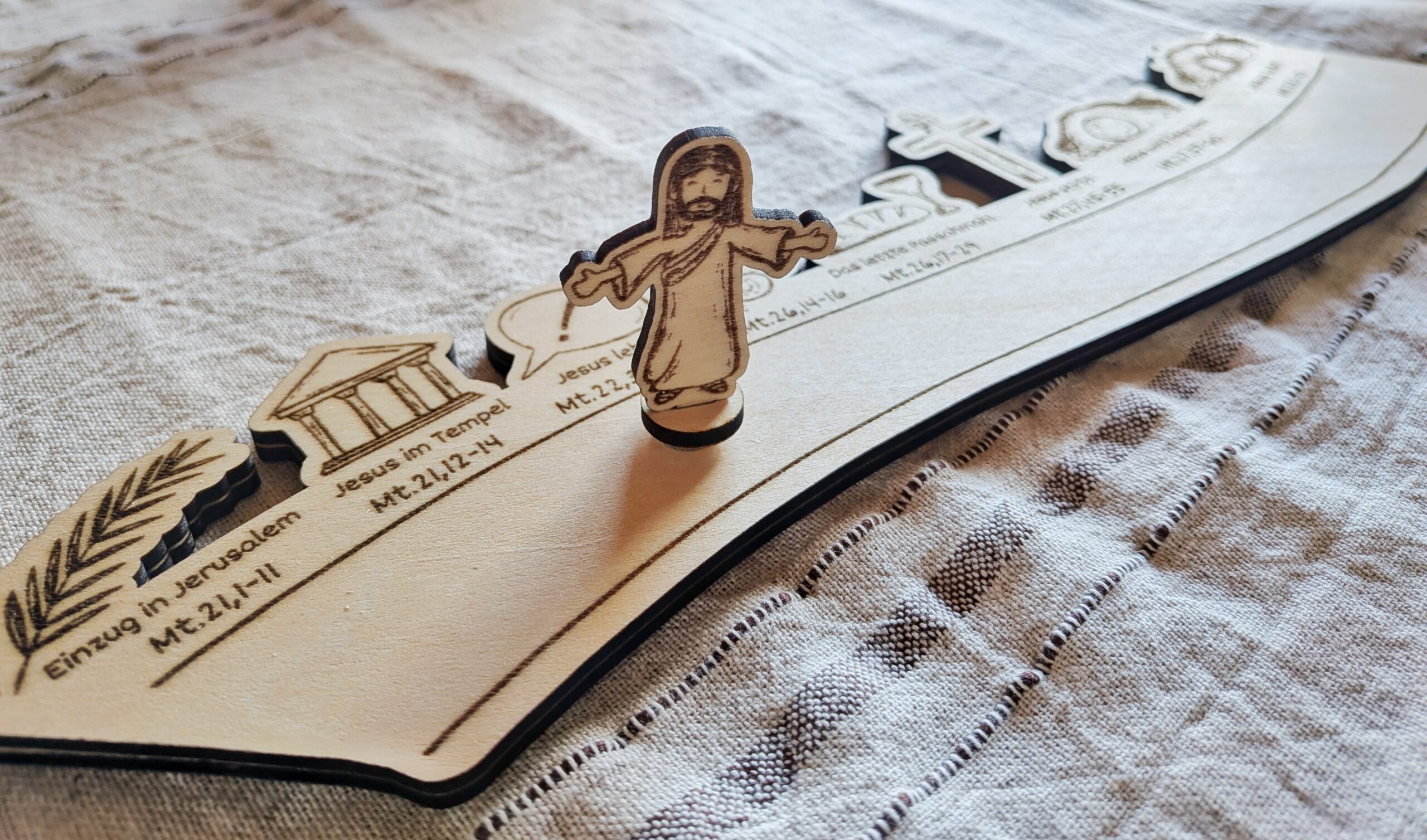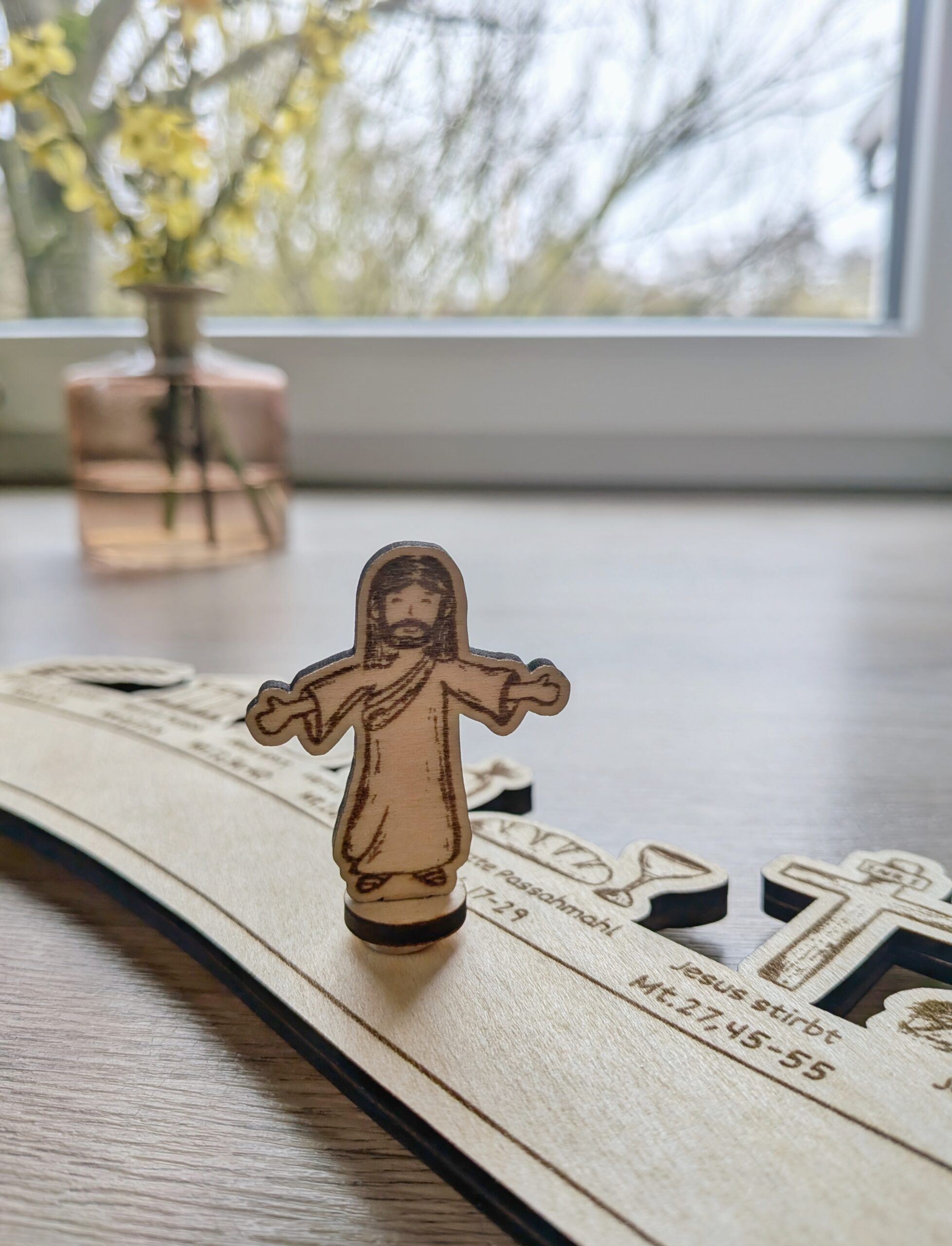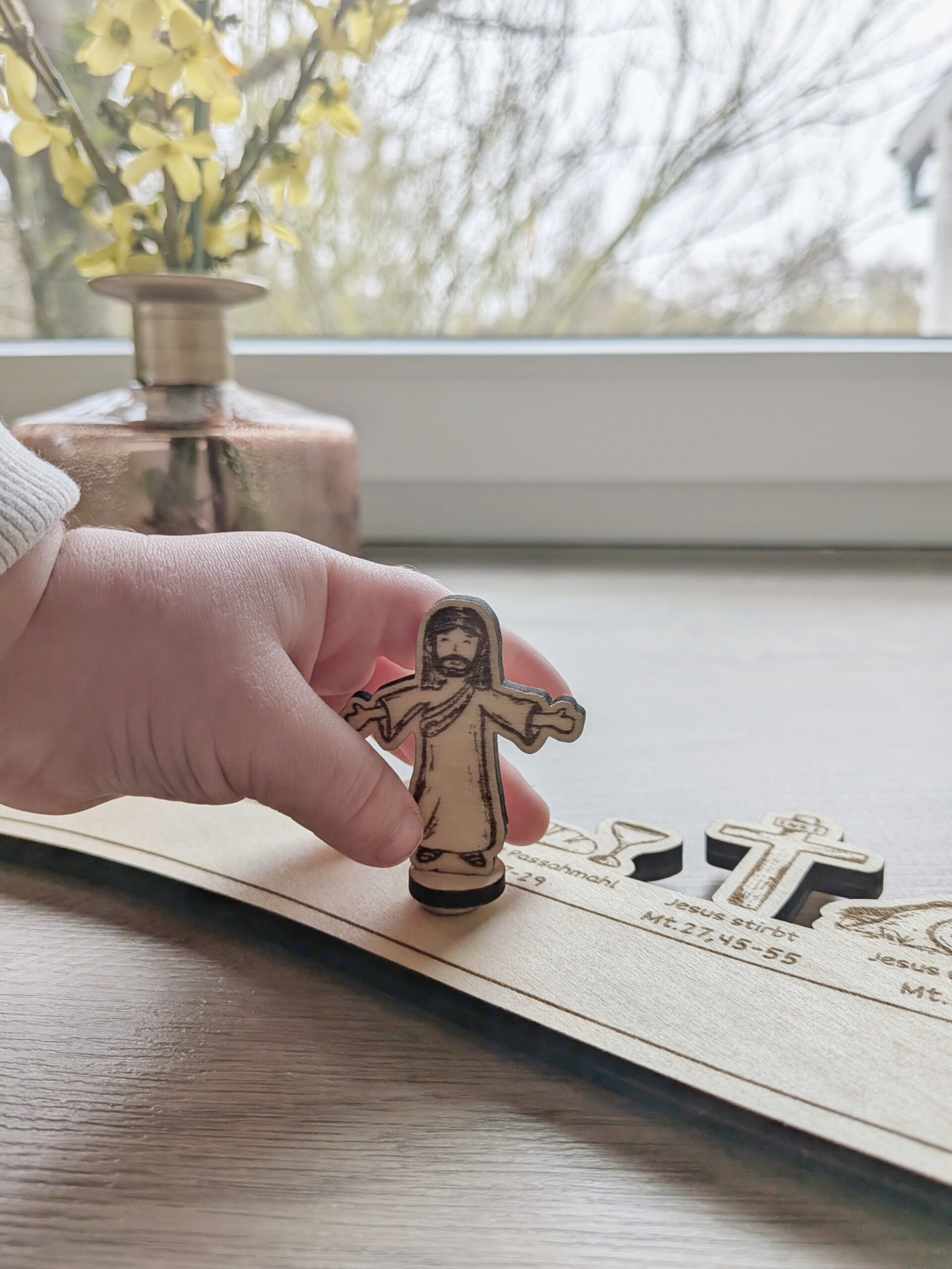 Vor Weihnachten haben wir den Advent, um uns auf das Ereignis am Heiligen Abend vorzubereiten. Vor Ostern haben wir die Passionswoche. Adventskalender gibt es zu Hauf, „Osterkalender“ habe ich bis jetzt noch nicht gesehen. So kam mir die Idee, den Passionsweg Jesu zu gestalten. Er beginnt an Palmsonntag, wo Jesus in Jerusalem einzieht und endet am Ostersonntag, dem Tag der Auferstehung. Jeden Tag geht die Jesus Figur ein Ereignis weiter. Dazu kann die passende Bibelstelle aus dem Matthäusevangelium gelesen werden.