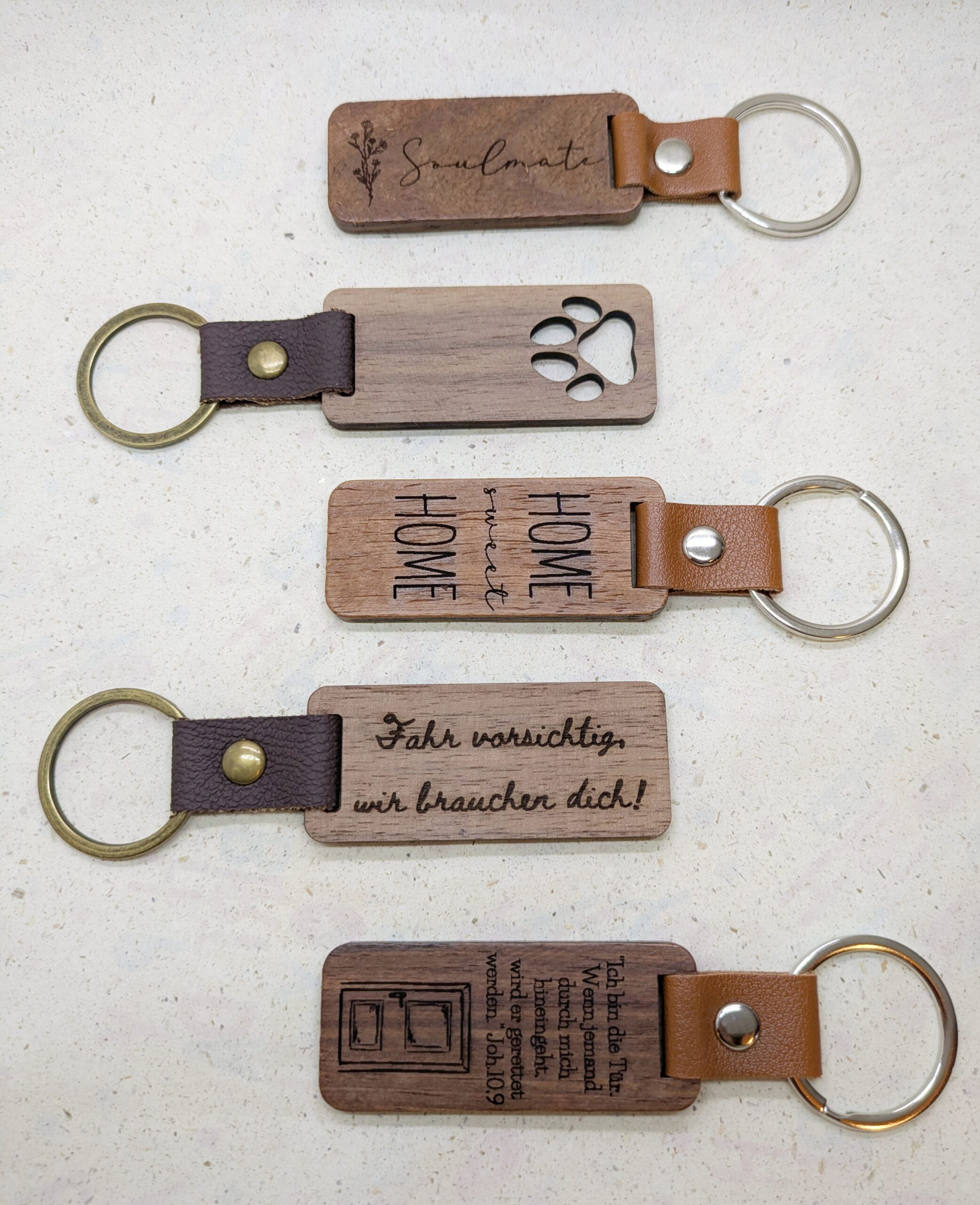 Schlüsselanhänger aus Holz mit Lederband und Spaltring