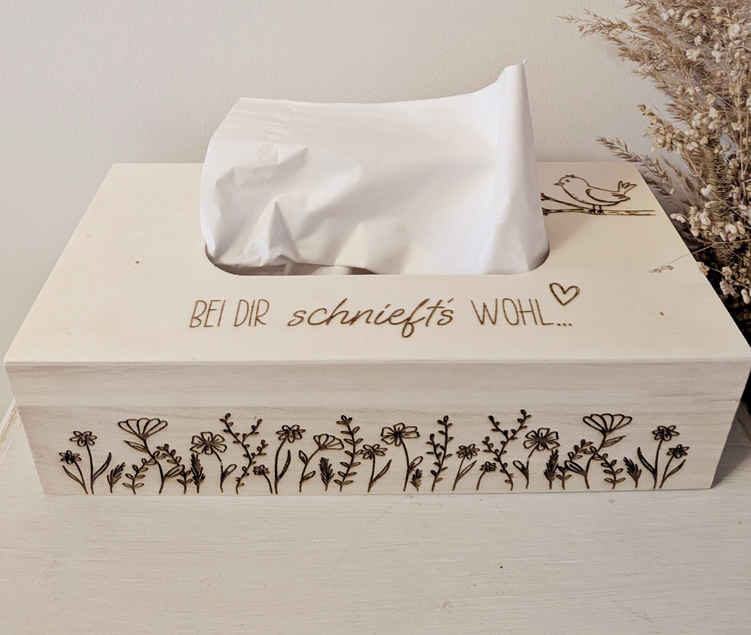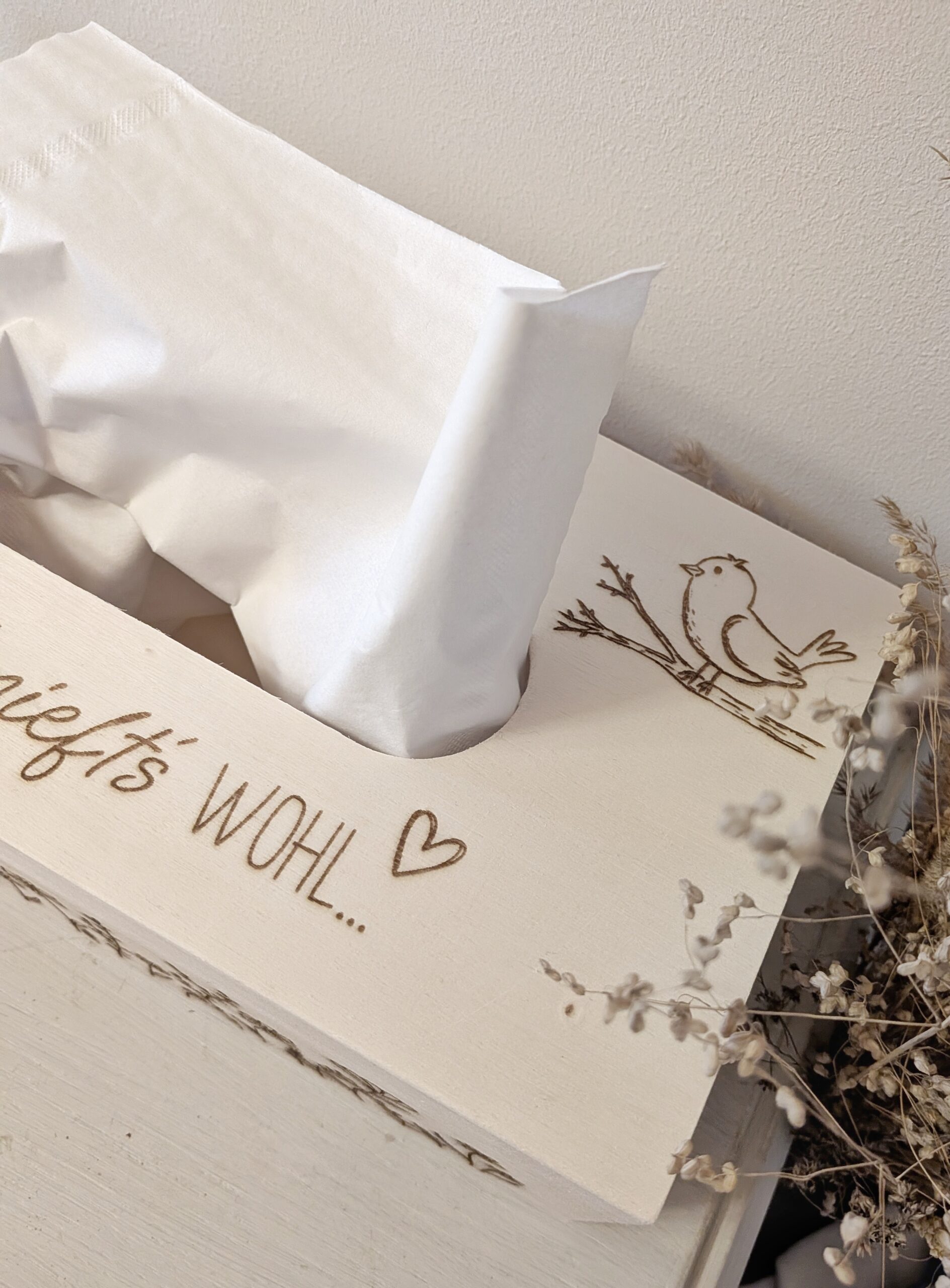Ich brauche sie ständig – Taschentücher. Irgendwem läuft immer die Nase, mehrmals am Tag braucht jemand ein Tuch. Wie praktisch, wenn die Tücher dann in einer Box an einem festen Platz stehen, wo auch die Kleinsten sie finden können.